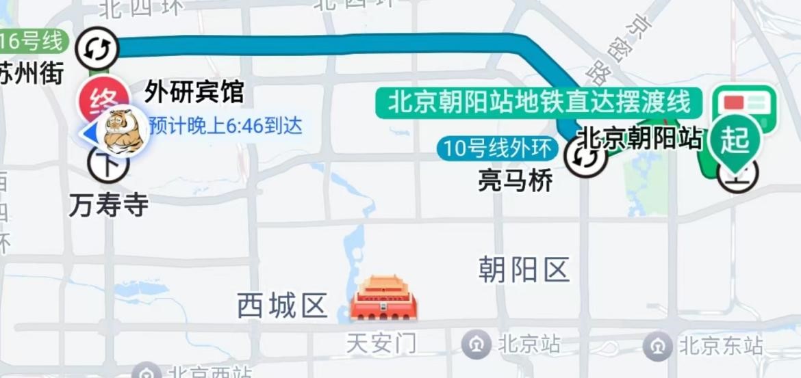 4.3若您从北京朝阳站(高铁站)出发,可先前往北京朝阳站(公交站),乘坐北京朝阳站地铁直达摆渡线,2站后在燕莎桥东下车后,向西南方向直行到亮马桥地铁站乘坐10号线三元桥方向至苏州街地铁站下车,站内换乘16号线宛平城方向,在万寿寺站(A西北口)下车,下车后向北直走进入西三环北路,前行即可到达外研宾馆。如家酒店位于外研宾馆北1公里处,步行十分钟可达。该路线用时约1小时30分钟,线路如图3所示。