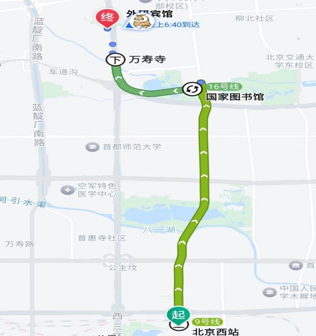 4.2若您从北京西站(高铁站)出发,可以乘坐地铁9号线北京西站国家图书馆方向,在国家图书馆站下车,站内换乘16号线北安河方向,在万寿寺站(A西北口)下车,下车后向北直走进入西三环北路,前行即可到达外研宾馆。如家酒店位于外研宾馆北1公里处,步行十分钟可达。该路线用时约40分钟,线路如图2所示。