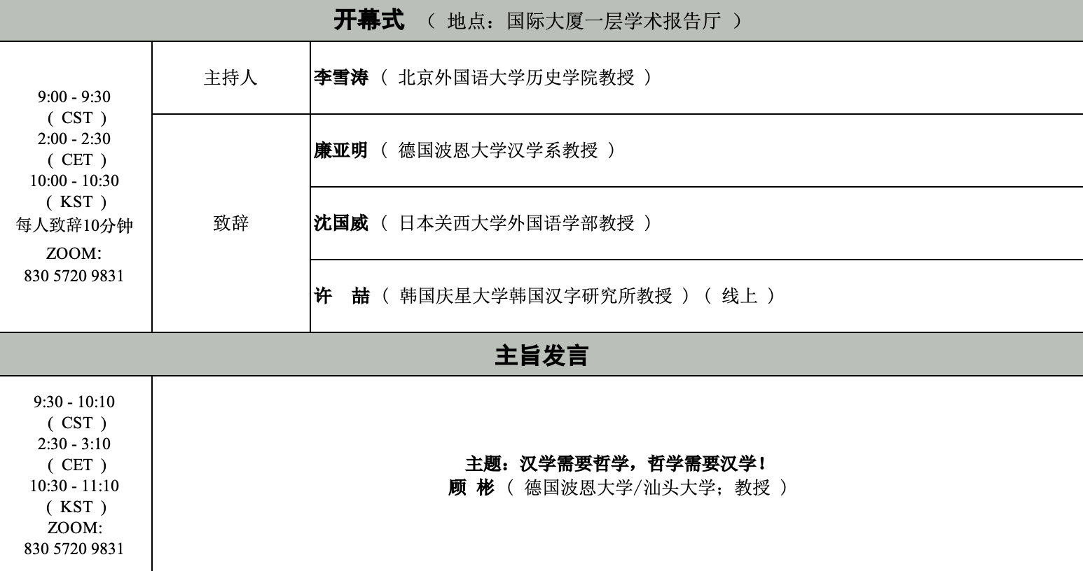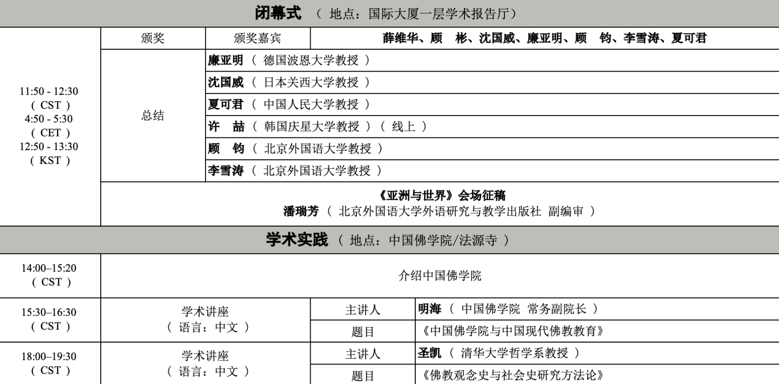 本届论坛将于25日上午在北外西校区国际大厦举行开幕式,由顾彬教授发表主旨演讲。随后各位学者将在25-26日间进行共四场的分论坛讨论。26日论坛闭幕,随后各位学者将前往中国佛公司(法源寺),参加明海法师、圣凯法师主持的学术交流及学术实践活动。论坛具体的日程安排如下: