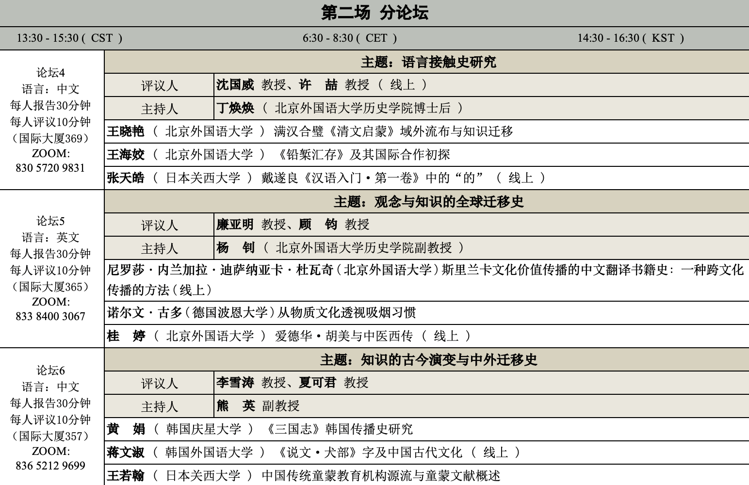 本届论坛的主题定为“全球史视野下的知识迁移与语言接触”,子主题包括语言接触史研究、概念史研究、知识迁移史研究、留学史研究、全球史专题研究等专题。本届论坛将由德国爱尔兰根-纽伦堡大学、德国波恩大学、德国哥廷根大学、韩国庆星大学、日本关西大学5所欧亚高校共同参与,旨在推动博士生跨国跨地域展开学术交流,建立共同研究的学术联系,探讨全球史视野下的知识迁移与语言接触等议题。