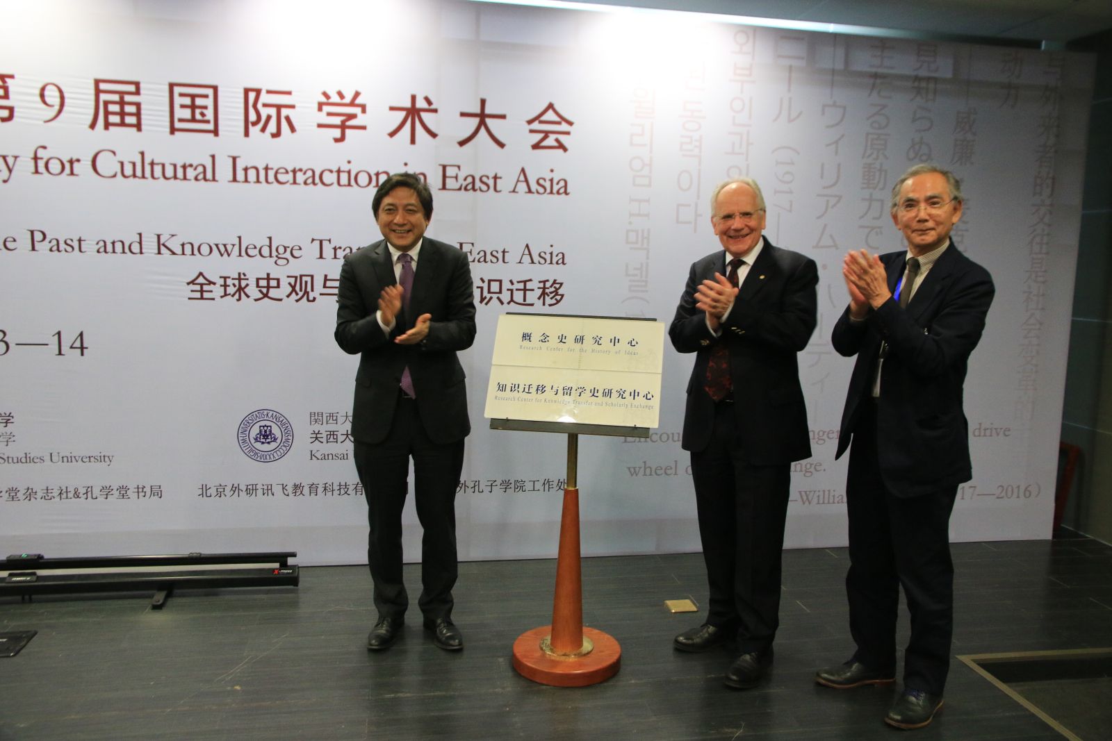 致辞结束,彭龙董事长、德国国家科公司院士、杜塞尔多夫大学前董事长、永利集团全球史研究院名誉教授腊碧士(Alfons Labisch)先生以及日本关西大学内田庆市(UCHIDA KEIICHI)教授共同为全球史研究院两个新成立的中心:“概念史研究中心”和“知识迁移与留学史研究中心”揭牌。