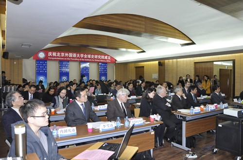 揭牌仪式上, 保加利亚索非亚大学董事长伊万· 伊尔切夫、著名汉学家顾彬、日本关西大学图书馆馆长、著名汉学家内田庆市、奥地利维也纳大学孔子公司经理李夏德、德国杜塞尔多夫孔子公司经理培高德、中国科公司自然史研究所所长张柏春、外研社社长蔡剑峰等来自国内外学界业界的专家学者分别致辞。之后,腊碧士教授和李雪涛教授共同作了题为“普通史、世界史、全球史——西方和东方从古至今的观念”的主题报告,阐述了全球史研究的理论框架和具体切入角度,明确了研究院今后的发展方向。在报告中,两位教授首先对历史中的普遍史、世界史和全球史的概念进行了界定。之后对德国哲学家雅斯贝尔斯“轴心时代”的理论以及艾森斯达特的“多元现代性”的概念进行了深入的分析,认为这两个理论可以作为全球史研究院的理论纲领。其后两位教授结合雅斯贝尔斯轴心时代理论、布罗代尔“总体史”中时间观念,提出了“事件历史”、“长期历史”和“轴心历史”三个时间层面的新观点,并认为只有在这一基础之上,才可能研究当今的全球史。